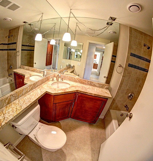 Awful Photos are presented without post-processing. A photo editor can really refine and tweak the photos to make the home look much more attractive. Below is a Smart Photo of a small bathroom made to look larger and fancier using a fish-eye lens and post processing. The photographer’s reflection on the mirror has also been removed. (Source: Smart Realty)