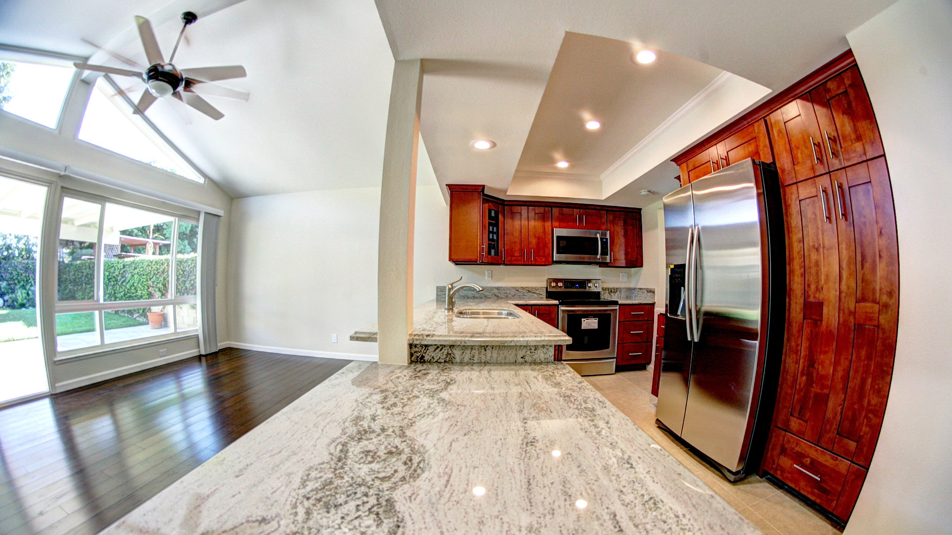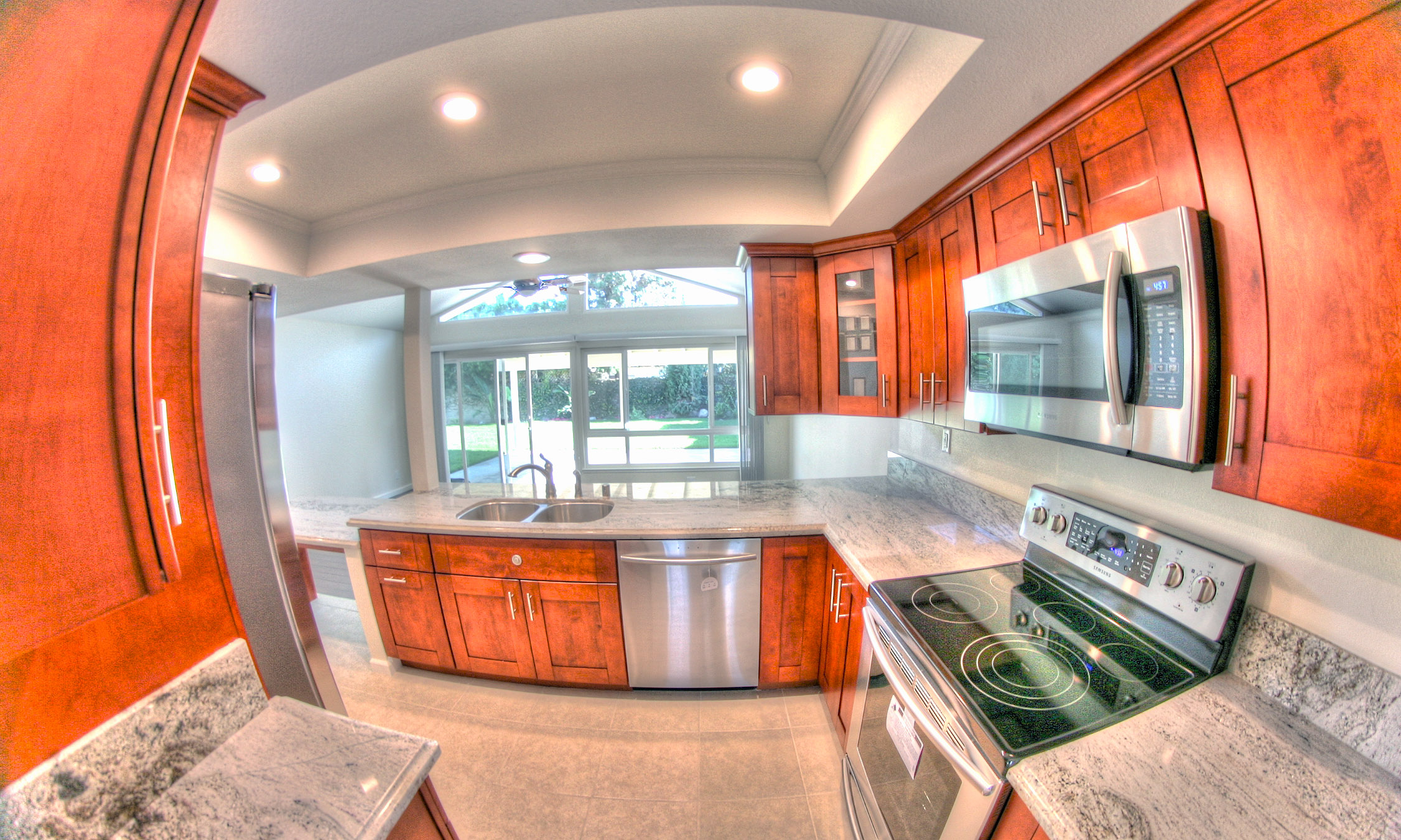 Fish-eye: For still images, fish-eye is useful for putting more of a room or space in a single image or helping to make smaller enclosed spaces look larger. It can also produce some interesting effects. A bathroom shot using fish-eye was shown above. Here’s a photo of the kitchen area of the same home.